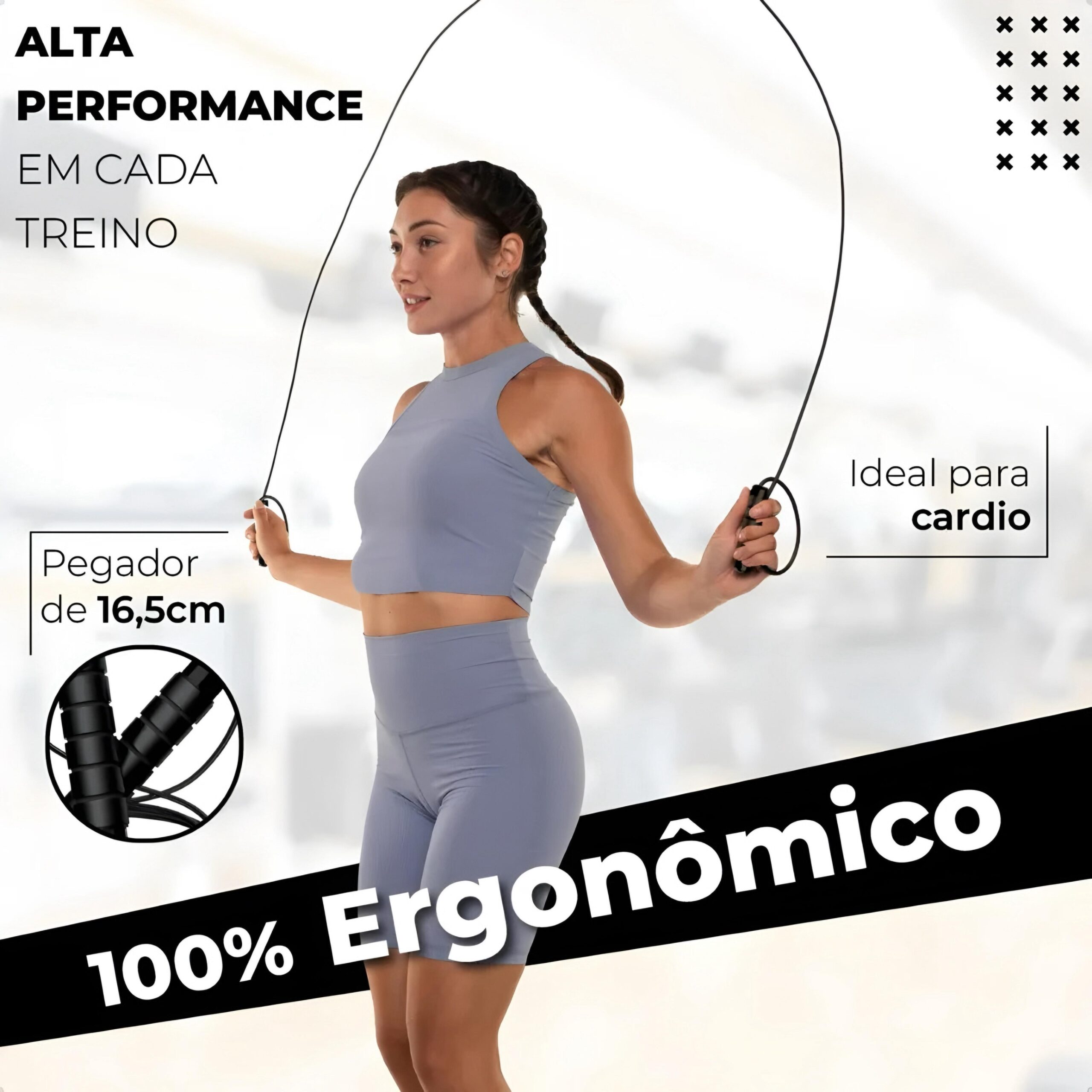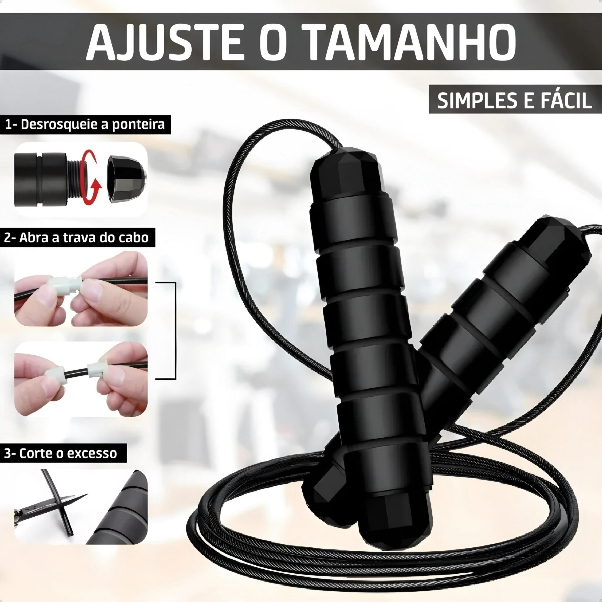 Para ajustar sua Corda de Pular, basta pisar no centro da corda com os dois pés e puxar as manoplas para cima. Elas devem chegar na altura das suas axilas. Com o sistema de ajuste da B-Max disponível na Achadinho Internet, você trava o cabo nessa medida e corta o excesso ou apenas o prende dentro da manopla, garantindo um giro perfeito para o seu biotipo.